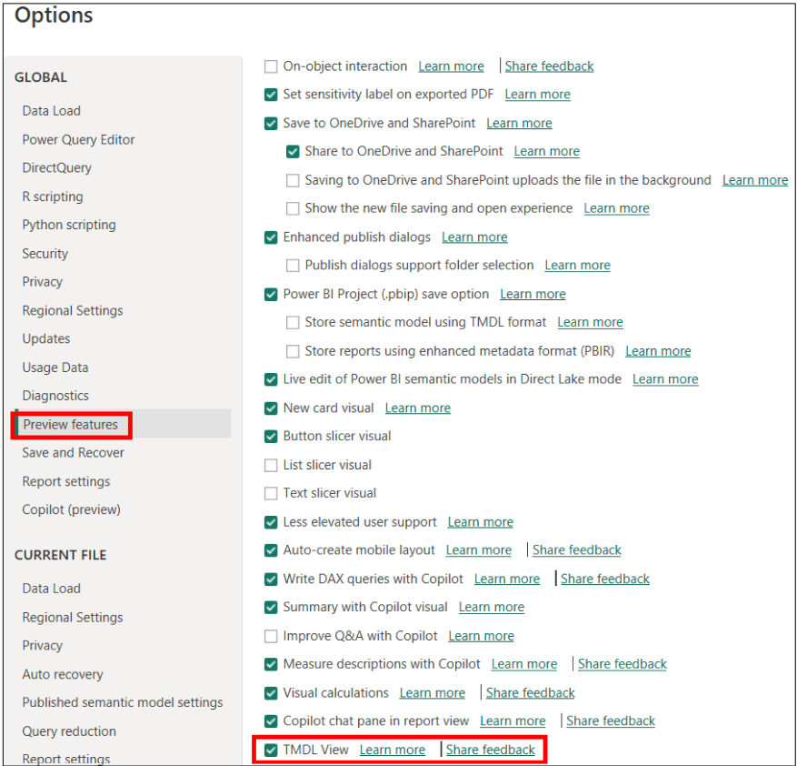 4. Onder “Preview features” zie je onderaan “TMDL view“. Vink deze aan.