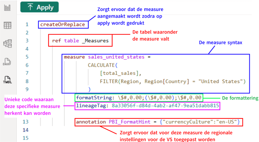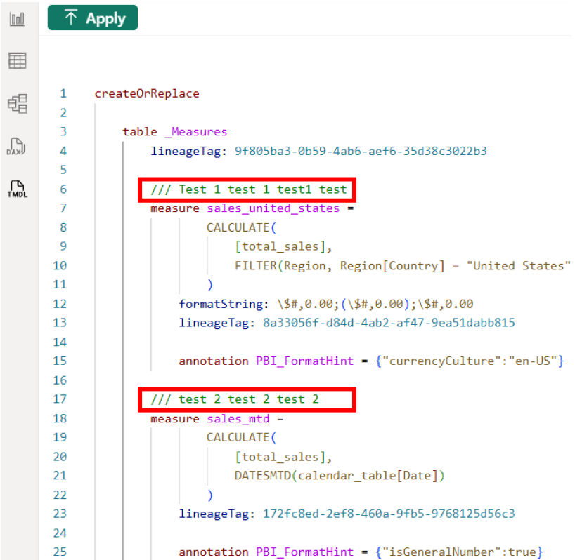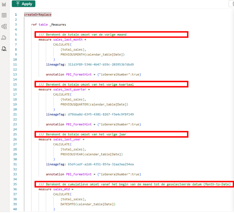 Nu kun je eenvoudig beschrijvingen toevoegen aan alle measures tegelijk door een regel startend met “///” boven elke measure te plaatsen. Nadat je de beschrijvingen hebt toegevoegd, klik je op Apply om je wijzigingen door te voeren en de measure-beschrijvingen bij te werken.