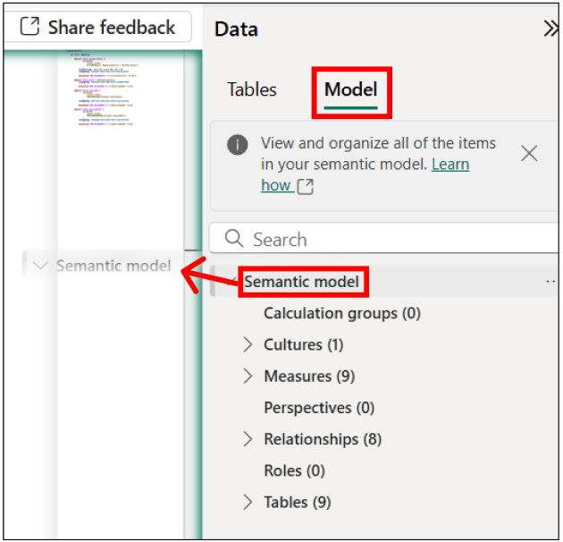 Door aan de rechterkant op “Model” te klikken, kun je het volledige semantische model naar de editor slepen. Dit biedt onder andere de volgende voordelen: