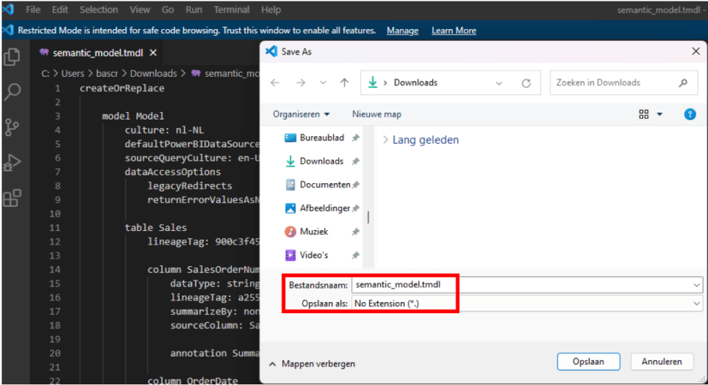 TMDL is ook een bestandstype. De simpelste en snelste manier om aan versiebeheer voor je semantisch model te doen is door deze “lomp” naar een text editor of IDE zoals VS Code te kopiëren en op te slaan met de .tmdl toevoeging (zie onderstaande afbeelding). In de achtergrond zie je dat ik het semantisch model open heb staan in VS Code. Deze file kun je nu naar je versiebeheerprogramma naar keuze pushen. Dit is vooral handig als je semantisch model voor meerdere rapporten gebruikt wordt.