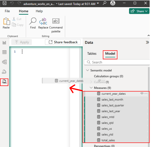 • Kopieer de syntax uit de TMDL-weergave nadat je de measures erin hebt gesleept.